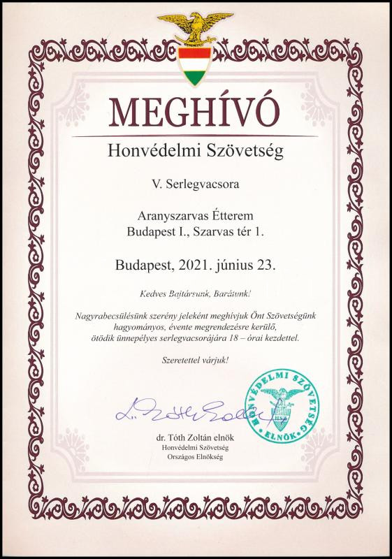 2021 A Honvédelmi Szövetség V: Serlegvacsorája Somogyváry Gyula (1895-1953) tiszteletére oklevél 20x30 cm