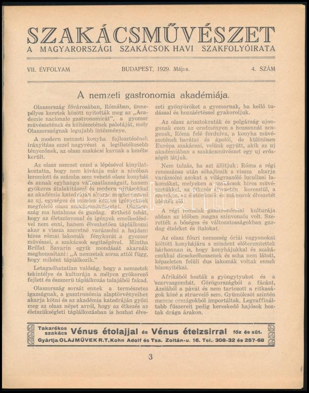 1929 Szakácsművészet A magyarországi szakácsok havi szakfolyóirata VII...