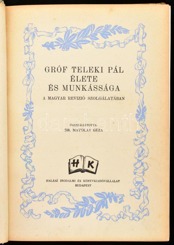 Dr. Matolay Géza: Gróf Teleki Pál élete és munkássága a magyar revízió... https://www.darabanth.com/en/452-Online-auction/452.0/Books/Books-History~1000019/Dr-Matolay-Geza-Grof-Teleki-Pal-elete-es-munkassaga-a-magyar-revizio-szolgalataban-Bp~II2979456