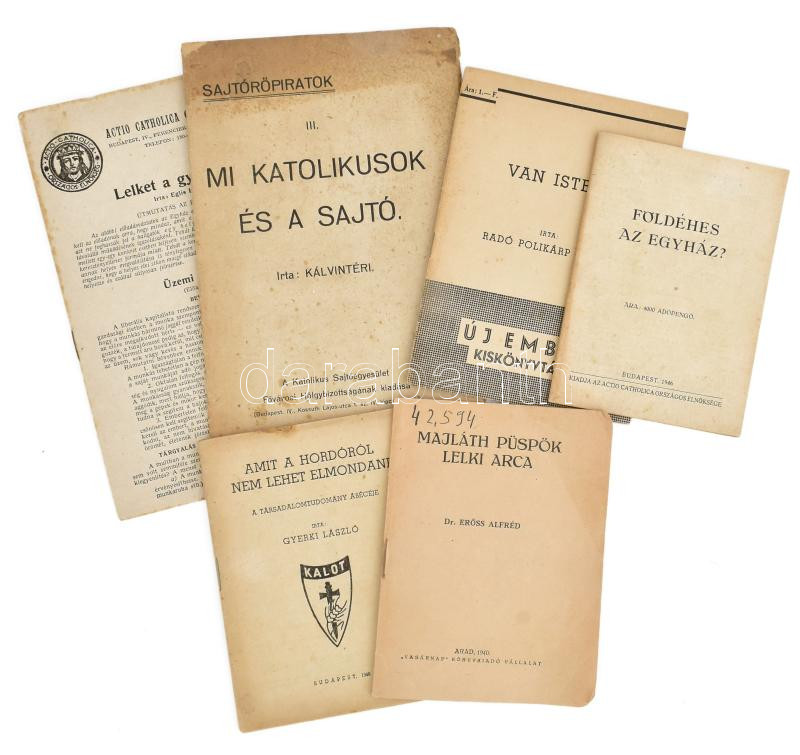 6 db régi vallási témájú kiadvány: Erőss Alfréd: Majláth püspök lelki arca. Arad, 1940, "Vasárnap". 39p. + Eglis István: Lelket a gyárakba. Bp., é.n. (1945-47 k.), Actio Catholica. 12p. + Radó Polikárp: Van Isten! Bp., 1946, Új ember kiskönyvtára. 16p. + Kálvintéri: Mi katolikusok és a sajtó. Bp., é.n. Katolikus Sajtóegyesület Fövárosi Hölgybizottságánal kiadása. stb. Kiadói papírkötés, részben kissé foltos.