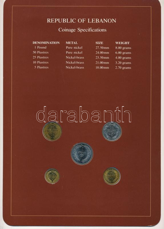 Libanon 1975-1981. 5p-1P (5xklf) "Coin Sets of All Nations" forgalmi s... https://www.darabanth.com/en/452-Online-auction/452.0/Numismatics/Foreign-Coin-sets~2500022/Libanon-1975-1981-5p-1P-5xklf-Coin-Sets-of-All-Nations-forgalmi-szett-felbelyegzett~II3006276