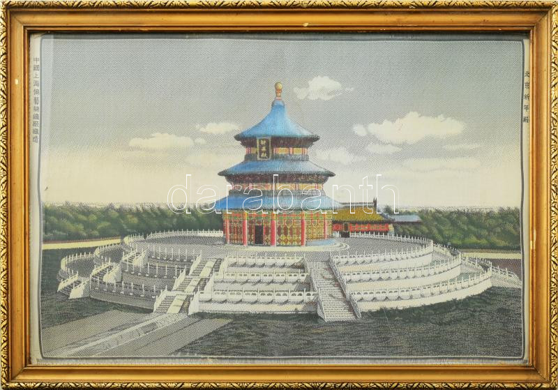Mennyei Béke Temploma, szőtt selyemkép. Dekoratív, üvegezett fakeretbe...