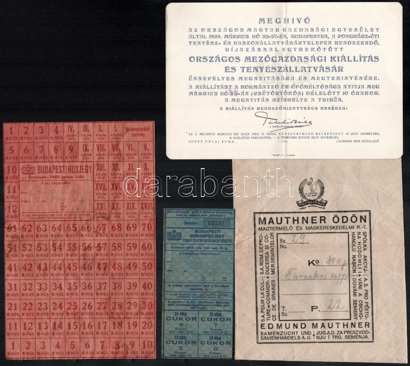 Description: 1939 Meghívó az Országos Magyar Gazdasági Egyesület által rendezett Országos Mezőgazdasági Kiállítás és Tenyészállatvásárra + 1944-1945 Budapesti húsjegy és cukorpótjegy + Mauthner Ödön Magtermelő és Magkereskedelmi Rt. reklám papírtasak. Változó állapotban.