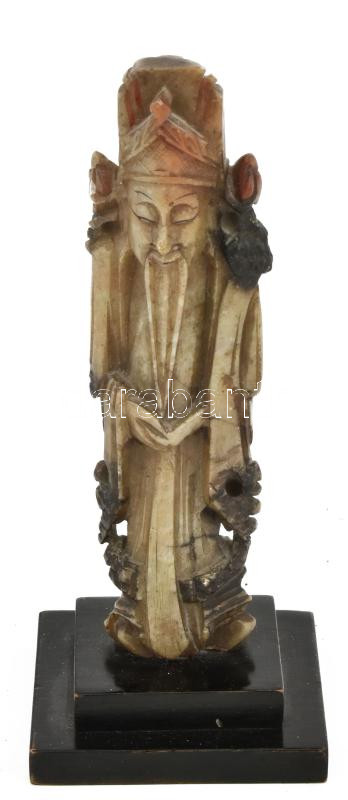 Távol-keleti bölcs, faragott zsírkő szobor, fa talapzaton, m: 17 cm