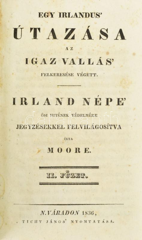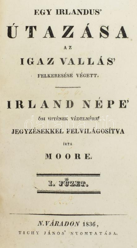 Description: (Thomas) Moore: Egy irlandus' útazása az igaz vallás' felkeresése végett. Irland népe' ősi hitének védelmére jegyzésekkel felvilágosítva. I-II. füzet. Nagyváradon, 1836, Tichy János, 294 p.; 4+285+9 p. Átkötött modern félvászon-kötések, körbevágottak.