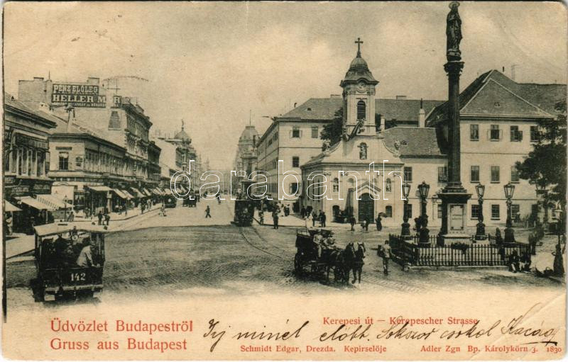 1898 (Vorläufer) Budapest VIII. Kerepesi út (Rákóczi út), Rókus kórház, lóvasút, Heller M. üzlete reklámja. Schmidt Edgar 1830. (EB)