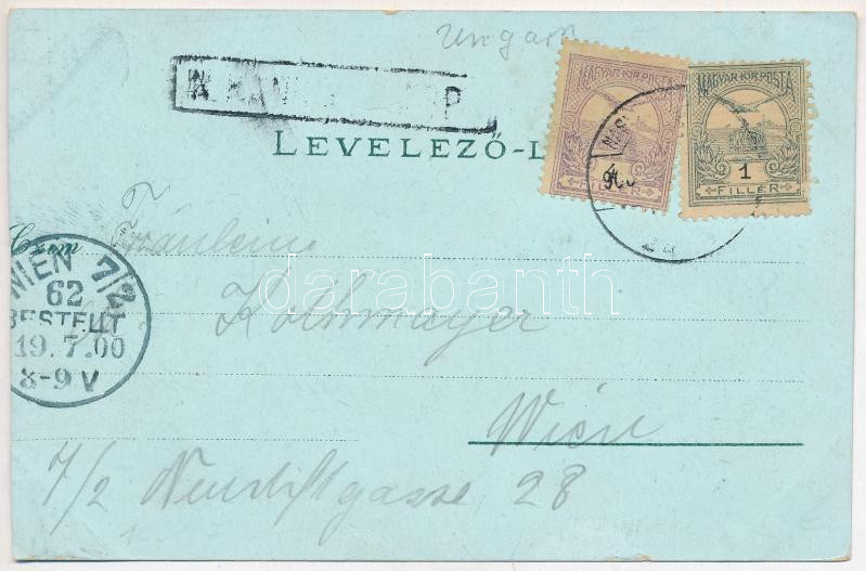 1900 Nagykanizsa, Csengeri utca, Deák és Fő tér, Városháza. Alt és Böhm kiadása, ezüstös floral, Art Nouveau, litho (vágott / cut)