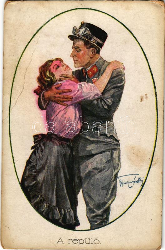 A repülő / WWI Austro-Hungarian K.u.K. military art postcard, pilot with lady, romantic couple. P.G.W.I. artist signed (fa)
