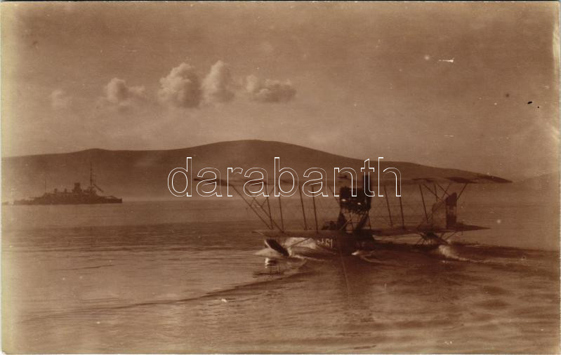 Description: K.u.K. Kriegsmarine Seeflugzeug / WWI Austro-Hungarian Navy Lohner Te-type flying boat (hydroplane) L-61 moves forward under her own power, most likely preparing to take off at Kumbor air station in the Bay of Kotor, SMS Budapest in the background. photo (fl)