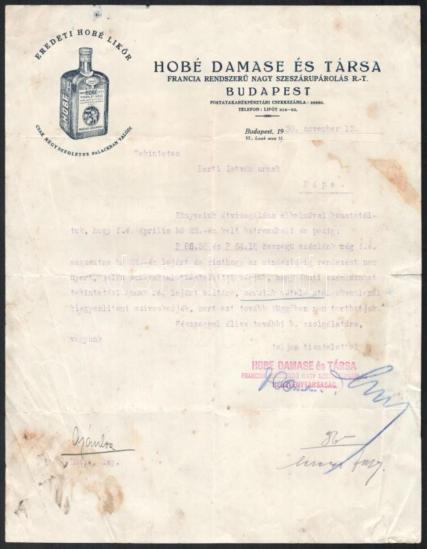 1930 Hobé Damase és Társa Francia Rendszerű Nagy Szeszárúpárolás R.T. üzleti levél, vízjeles, aláírt, kissé foltos