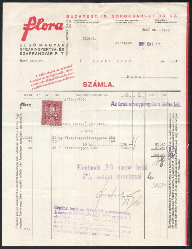1931 Flora Első Magyar Stearingyertya- és Szappangyár R.T. fejléces sz...