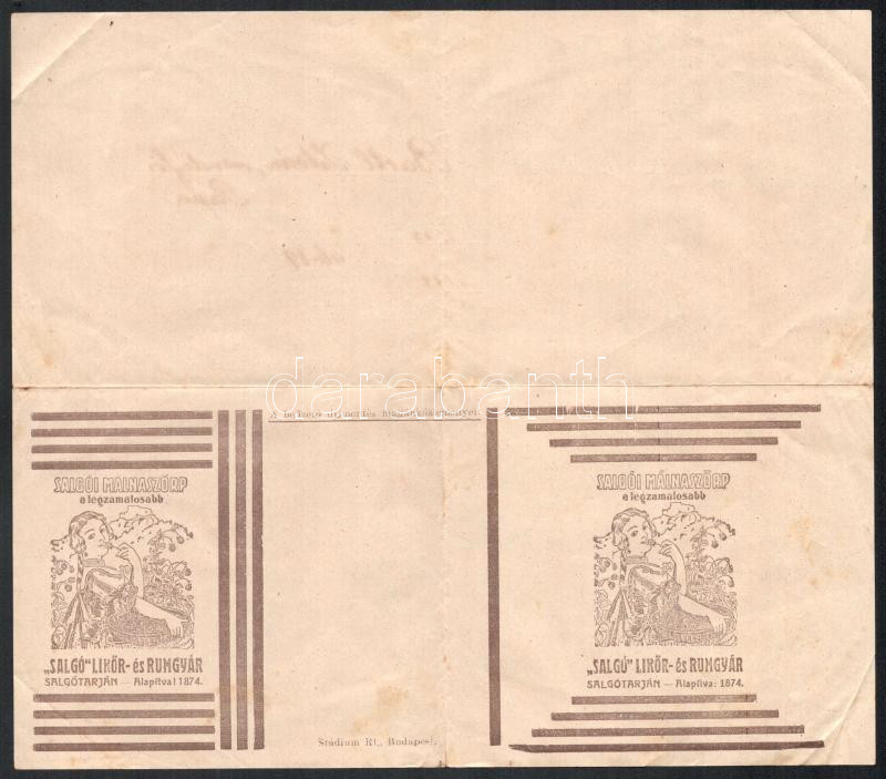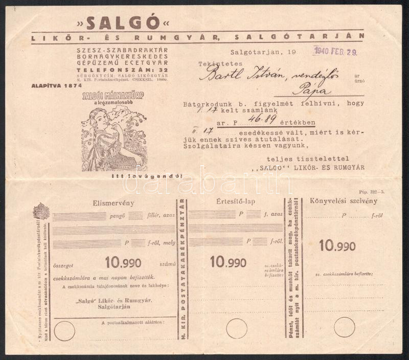 1940 ,,Salgó" Likőr és Rumgyár, Salgótarján Üzleti Levél, valamin... https://www.darabanth.com/en/454-Online-auction/454.0/Art-and-other-collectibles/Advertisement~2000024/1940-Salgo-Likor-es-Rumgyar-Salgotarjan-Uzleti-Level-valamint-befizetesre-szolgalo-k~II3030352
