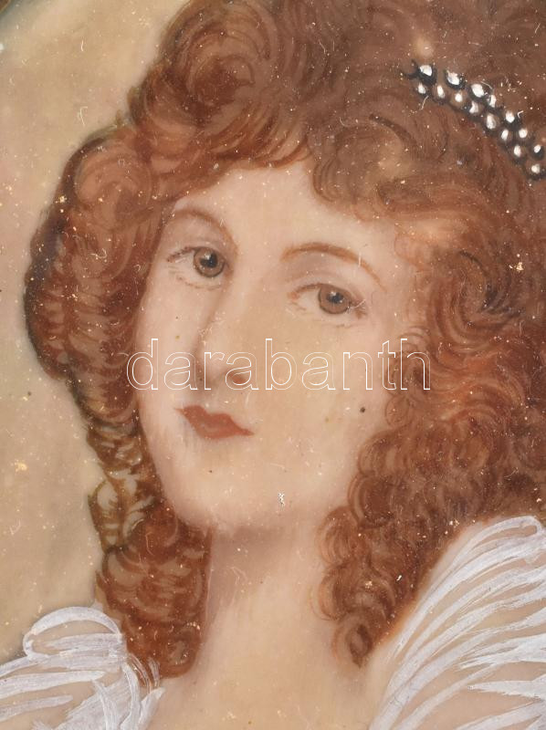 Antik csontra festett női portré 9x6,5 cm, csont elemekből épített keretben, 14x11 cm. Két keretelem hiányzik.