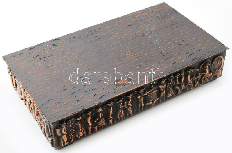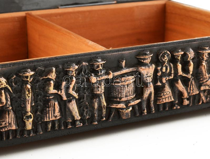 Dömötör László (1914-1995) iparművész szüreti jelenetes plasztikus réz doboz 20x11 cm