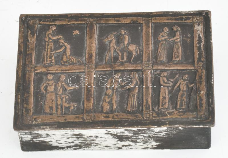 Tevan Margit (1901-1978): Iparművész fém doboz, plasztikus figurális díszítéssel. Réz, jelzett, kopással 11x8x3 cm