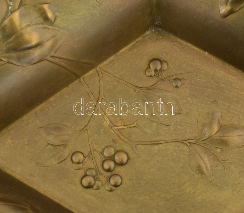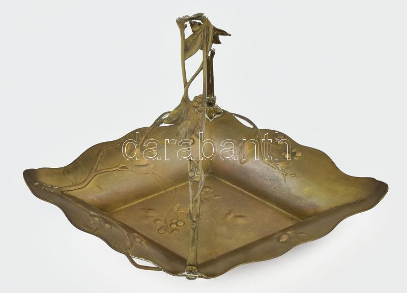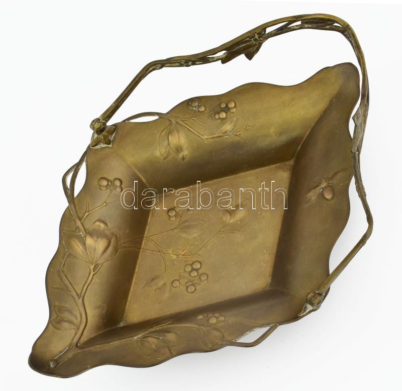 Description: WMF art nouveau alpakka kínáló. Billenthető fogóval, lemezbe domborított növényi ornamentikával és darázzsal díszítve, növényformái helyenként plasztikusan kapcsolódnak a domborított mintákhoz. Gömblábakon áll, melyből egy hiányzik. Jelzett, kopással, 30,5x22 cm