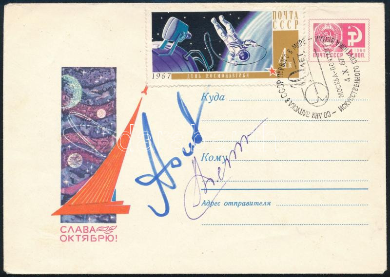Description: Anatolij Filipcsenko (1928-2022 ) és egy másik szovjet űrhajós aláírása emlékborítékon / Signature of Anatoliy Filipchenko (1928-2022) and an other Soviet astronaut on cover