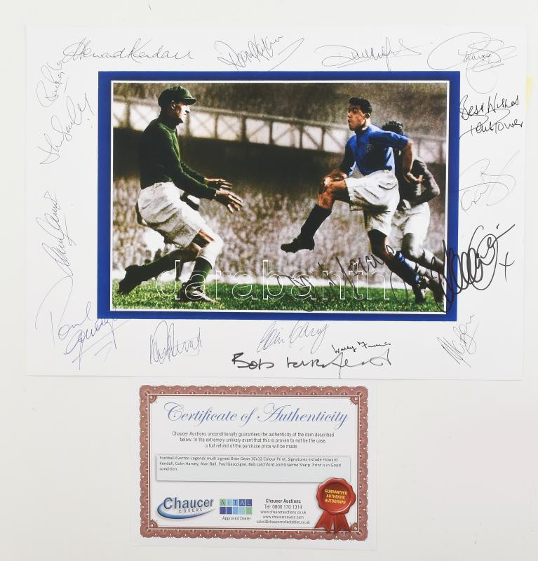 Az Everton FC angol labdarúgócsapat legendás játékosainak (Howard Kendall, Colin Harvey, Paul Gascoigne, stb.) autográf aláírásai fotónyomaton, tanúsítvánnyal, 40x30 cm / Autograph signatures of legendary Everton FC players (Howard Kendall, Colin Harvey, Paul Gascoigne, etc.), with certificate, 40x30 cm
