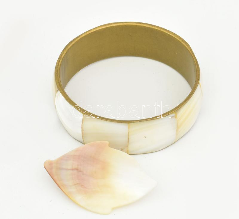 Gyöngyház berakásos réz karperec, d: 7 cm + gyöngyház bross, 5,5x4 cm