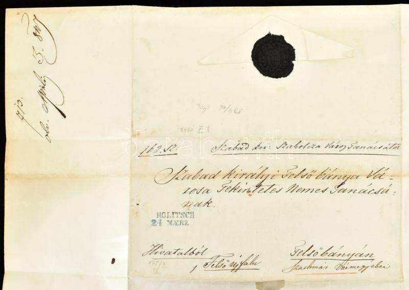 Description: 1847 Szakolca, Tűzvész és árvízkárosultak megsegítése ügyében tartott tanácsülés nyomtatott körlevele, főszolgabíró és főjegyzői aláírásokkal. Szakolca sz. kir. város tanácsától Felsőbánya sz. kir. város tanácsának. Kék "Holitsch" bélyegzéssel, viaszpecséttel.