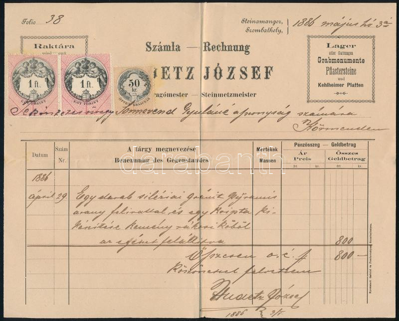 1886 Szombathely, Hudetz József kőfaragó mester számlája, körmendi lakos részére, 2 db 1 ft., és 1 db 50 kr okmánybélyeggel, hajtott.