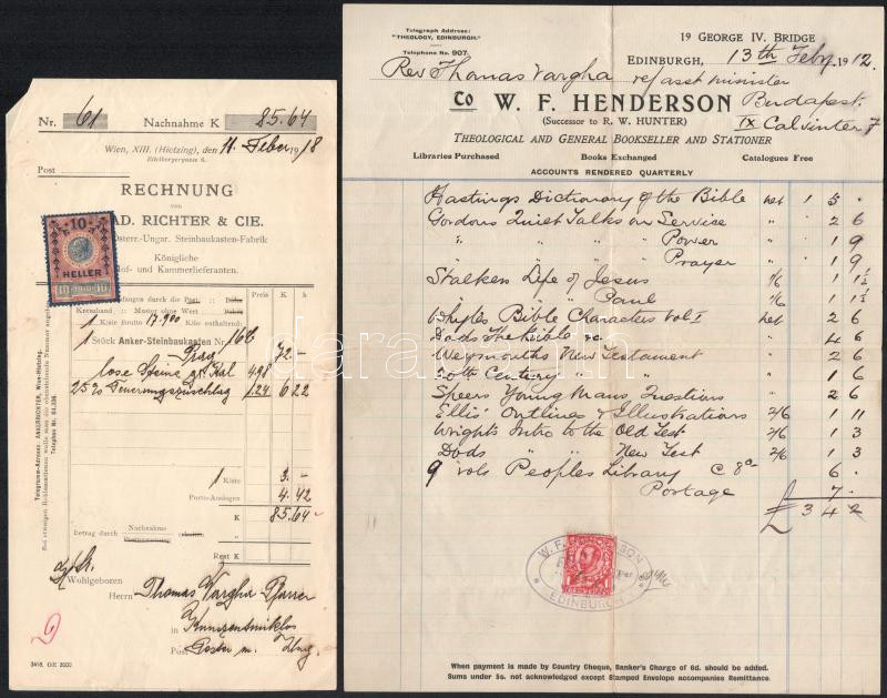 1912 Edinburgh, Henderson számla Vargha Tamás (1890-1968) író, költő, református lelkész részére