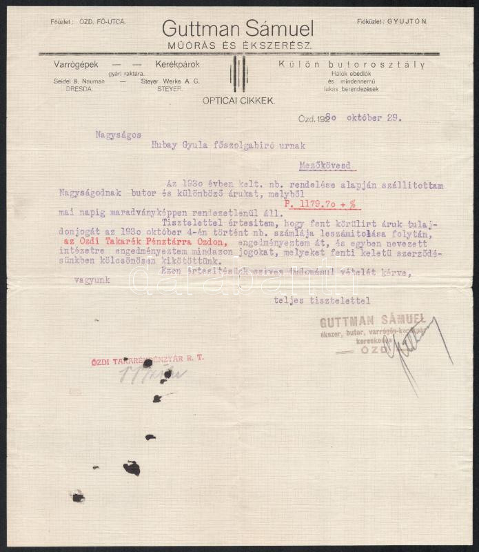 1930 Ózd Guttmann Sámuel ékszer, bútor, varrógép, kerékpár kereskedés fejléces számlája