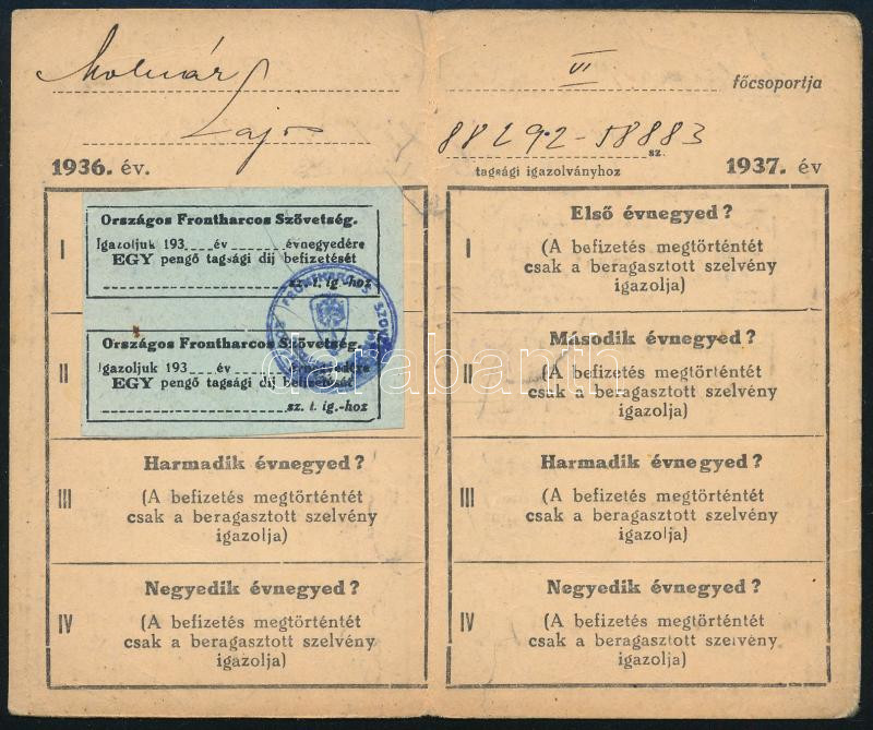 1936 Az Országos Frontharcos Szövetség befizetési lapja, 1936. első két negyedévi 1P tandíj befizetését igazoló tagdíjbélyegekkel