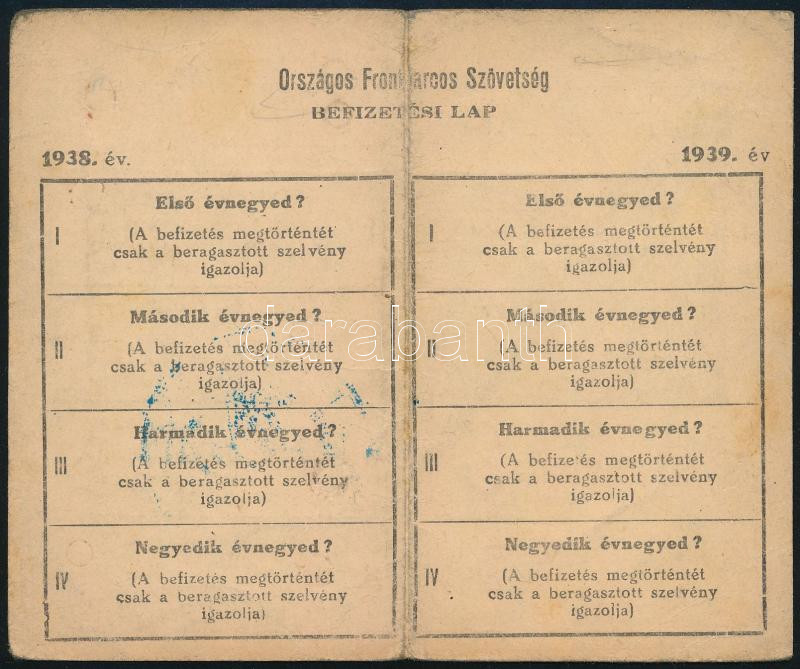 1936 Az Országos Frontharcos Szövetség befizetési lapja, 1936. első ké...
