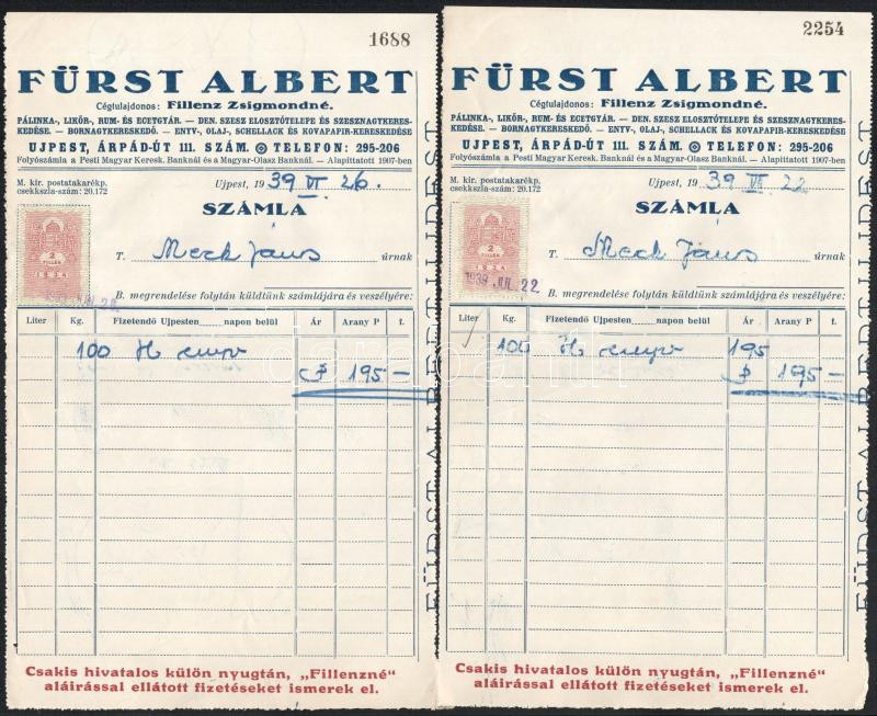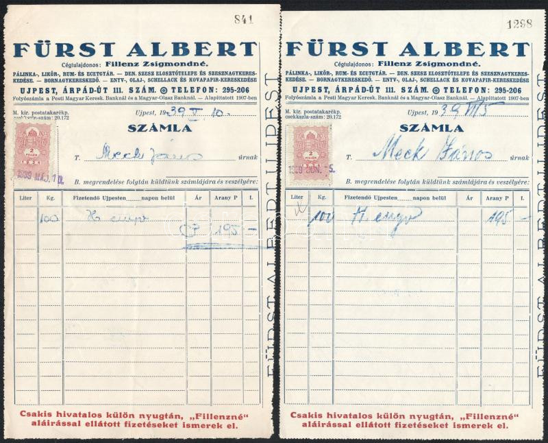 1939 Újpest, Fürst Albert pálinka-, likőr-, rum- és ecetgyár, szesz- és bornagykereskedő (stb.) 5 db fejléces számlája, 2f okmánybélyegekkel