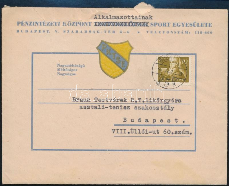 1947 Bp., Pénzintézeti Központ Alkalmazottainak (korábban Tisztviselőinek) Sport Egyesülete (P.K.A.S.E.) asztalitenisz szakosztályának levele a Braun Testvérek Rt. likőrgyár asztalitenisz szakosztálya részére, fejléces levélpapíron, borítékkal
