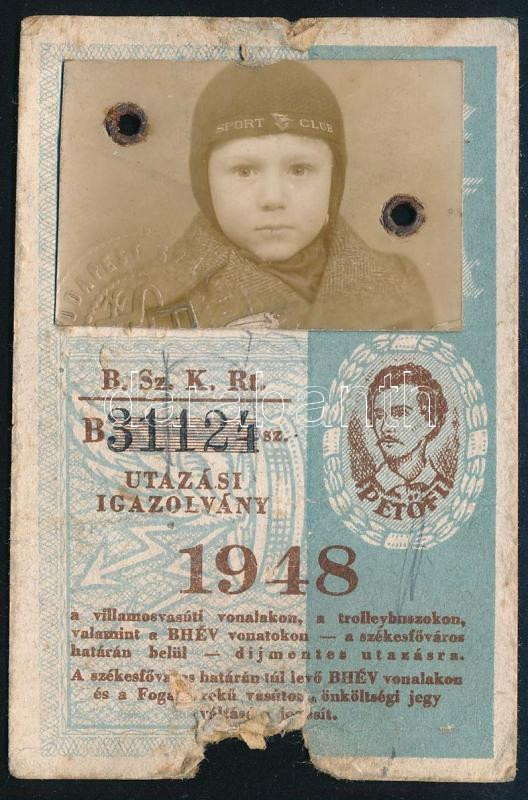 1948 B. Sz. K. Rt. fényképes bérletigazolványa, "Sport Club" feliratú sapkával, "Petőfi arcképével" az igazolványon, az alján hiánnyal.