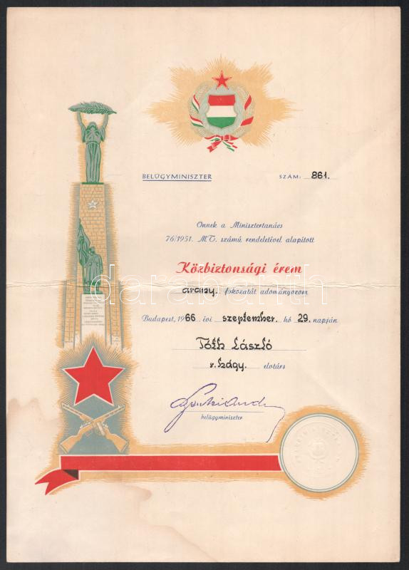 Description: 1966 Közbiztonsági Érem arany fokozatának adományozó oklevele, Benkei András belügyminiszter aláírásával, szárazbélyegzővel. (A Felszabadulási emlékművet, ill. Kádár-címert ábrázoló illusztrációval). Középen hajtott, egyik sarkán ázásnyommal, 29,5x21 cm