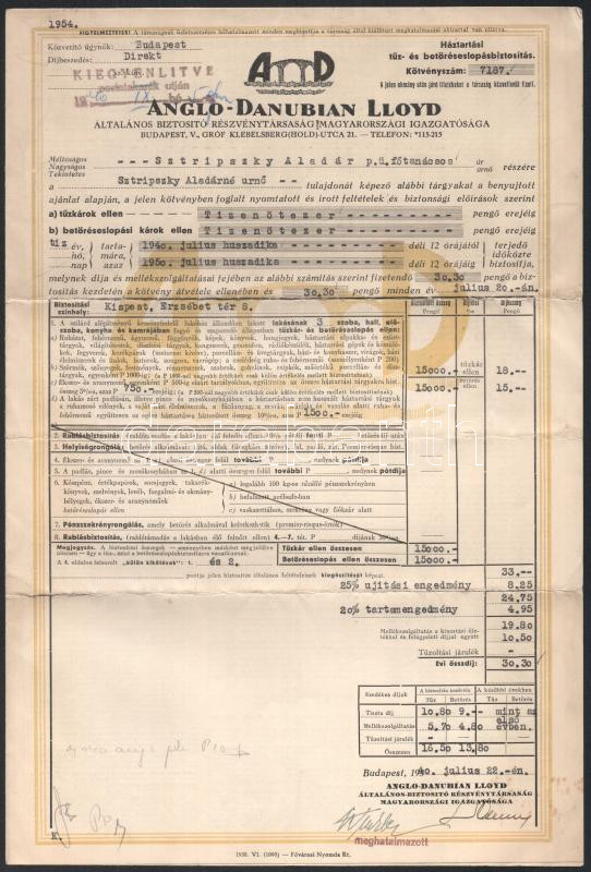 cc a 1930 Anglo-Danubian Lloyd biztosítási kötvény