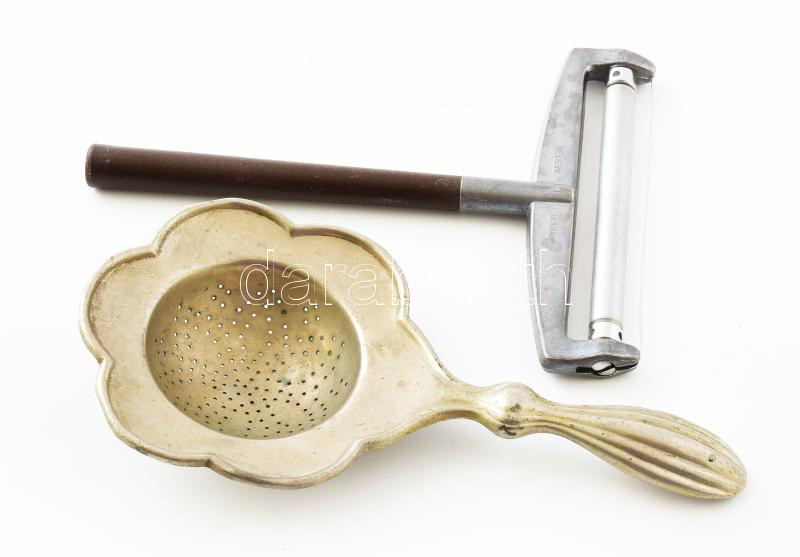 2 db német konyhai eszköz: Berndorf alpakka teaszűrő + Westmark Rollschnitt sajtszeletelő, jelzettek, h: 16-18 cm