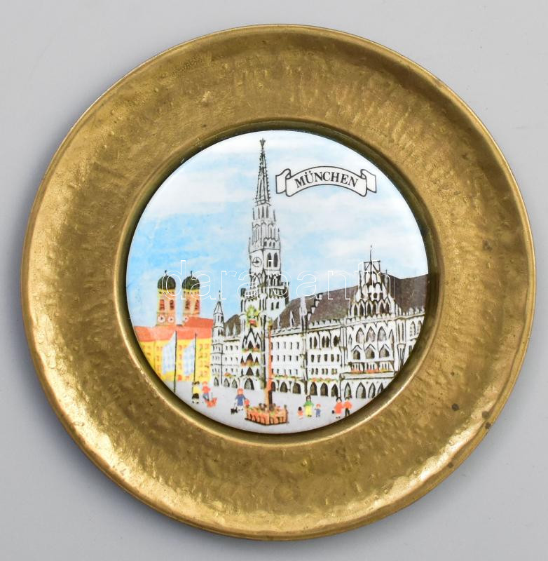 Müncheni városkép porcelán tálka, bronz alapba ragasztva, szép állapotban, d: 15 cm