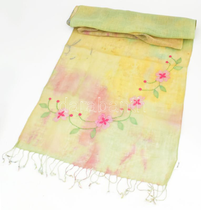 Virágos, rojtos vászon sál, jelzett, kb. 175x45 cm