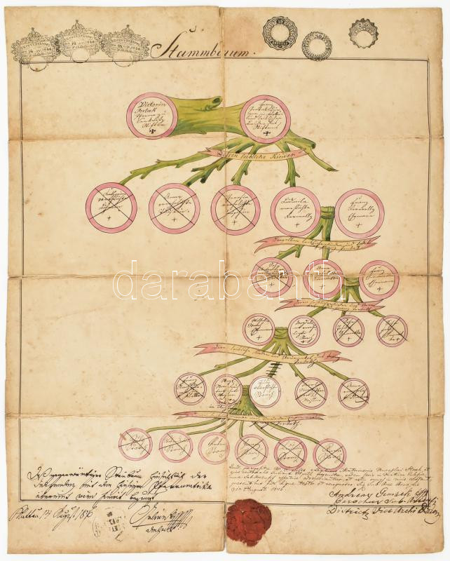 1846 Leszármazási tábla. Putak és Bordy? család. Kézzel festett, számos, klf címletű benyomott szignettával, hajtásoknál kis beszakadásokkal 36x48 cm