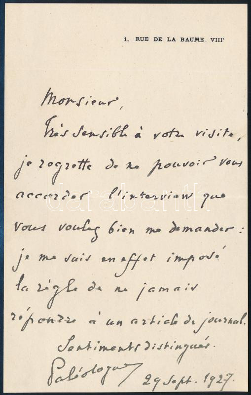1927 Maurice Paléologue (1859-1944) francia diplomata, nagykövet, történész autográf levele Szentgyörgyi Ferenc, született Orsits Ferenc (1892-1948) író, újságírónak interjú megkeresésére válaszul. Egy beírt oldal,. / Autograph letter of Maurice Paléologue (1859-1944) embassador of France to Russia to a Hungarian journalist. One page