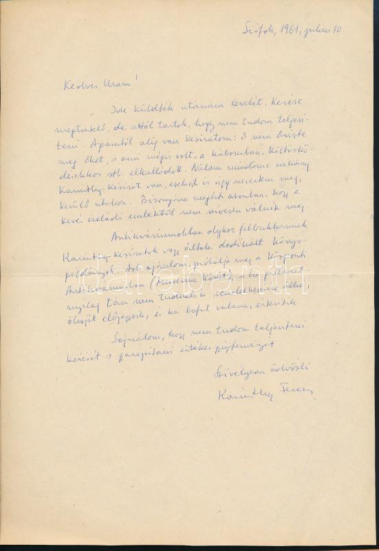 1961 Karinthy Ferenc (1921-1992) író autográf levele Frank Tibor történésznek, melyben jelzi, hogy nincs Karinthy kézirata amit adhatna neki, és antikváriumhoz tanácsolja. Egy beírt oldal, borítékkal.