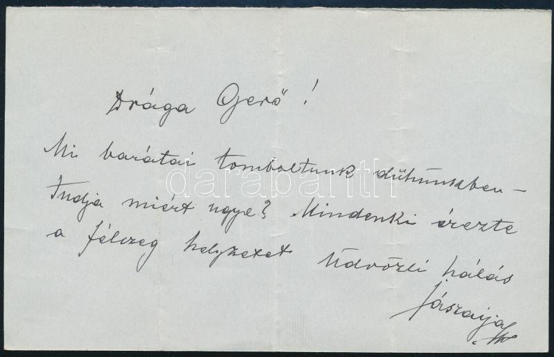 cca 1910 Jászai Mari (1850-1926) színésznő autográf sorai Gerő Ödön (1863-1939) művészeti újságíró, szerkesztőnek: "Mi barátai tomboltunk dühünkben - tudja miért ugye? (...)". Egy beírt oldal, Jászai Mari autográf aláírásával.