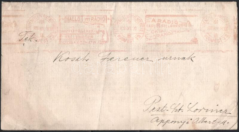 cca 1928-1929 Gépelt levél, a hátoldalán "Halló, itt Rádió", rádiót reklámozó bélyegzésekkel.