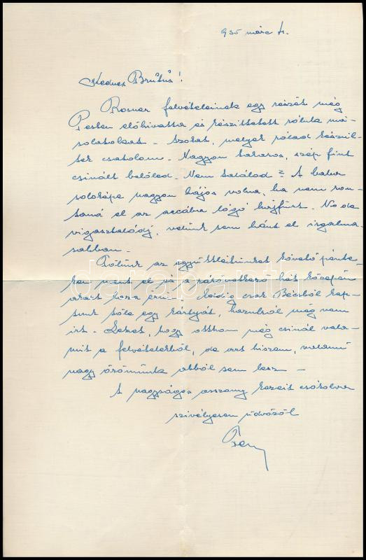 cca 1930-40 6 db Sárdy Brutus festőművésznek, a Fővárosi Képtár restaurátorának küldött levél és levelezőlap, egyikben említve Pogány Ö. Gábor (1916-1998) művészettörténész, a Magyar Nemzeti Galéria későbbi igazgatójának és egy másik Krusnyák Károly (1889-1960) festőművész gépelt levele autográf aláírásával. Többi levél beazonosítandó aláírásokkal és nevekkel