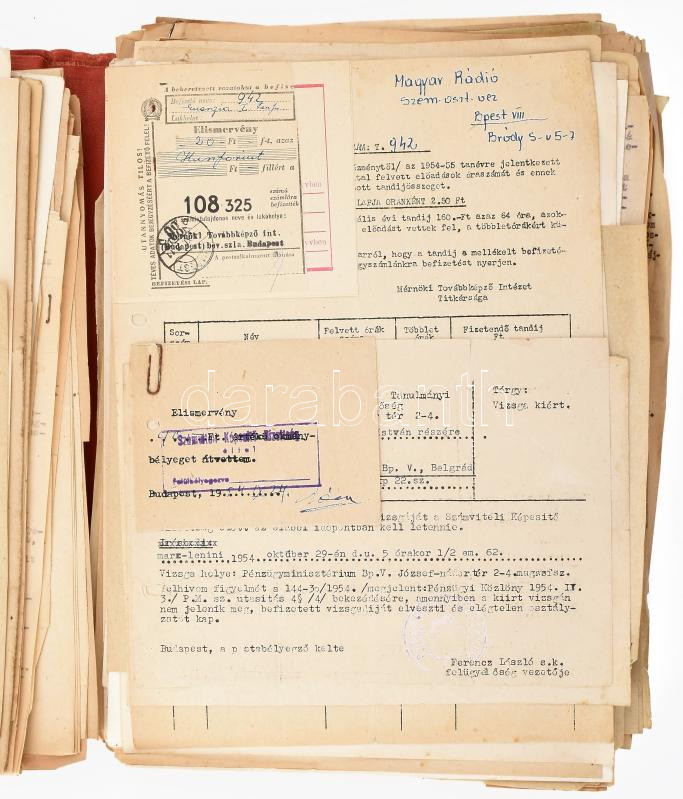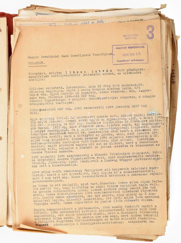 cca 1947-1970 Ildzsa István (1911-?) pénzügyminisztériumi osztályvezető, pártkáder, a Magyar Rádió, ill. a Magyar Beruházási Bank alkalmazottjának vegyes iratai (főként a Rákosi-korszakból): önéletrajzok, hivatalos levelek, ajánlások, kinevezések, stb. Közte érdekesebb darabokkal, aláírásokkal (többek között Olt Károly (1904-1985) pénzügyminiszter, az Országgyűlés elnökének autográf aláírásával). Kb. 130-140 oldalnyi, tartalmas anyag. Vegyes állapotban, kissé dohos lapokkal, mappában.