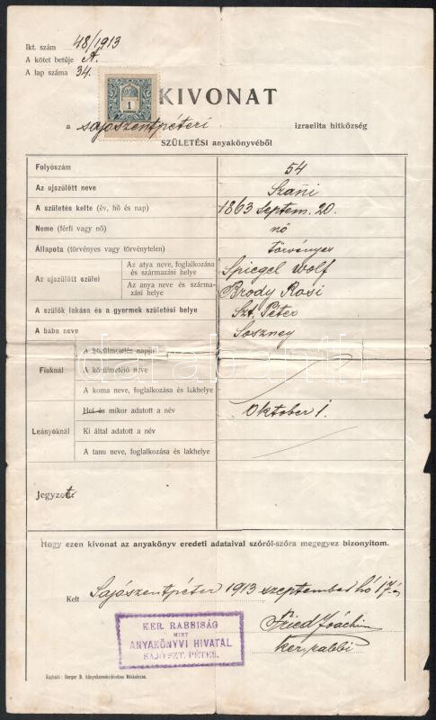 https://www.darabanth.com/en/454-Online-auction/454.0/Art-and-other-collectibles/Judaica~1500004/1913-Sajoszentpeter-kivonat-az-izraelita-hitkozseg-szuletesi-anyakonyvebol-Fried-Joachim-k~II3025719