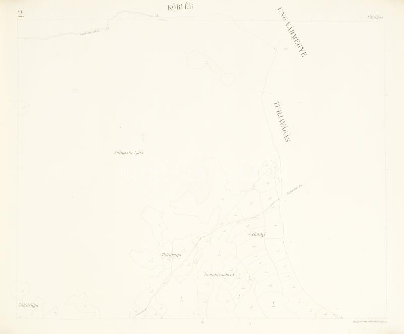 Description: 1913 Patakos Bereg vármegyei kisközség kataszteri térképének másolata az 1911. évi mérnöki nyilvántartás szerint (1. és 2. lap), 1 : 2880, Bp., M. kir. állami ny., feltekerve, kis foltokkal, 75x62