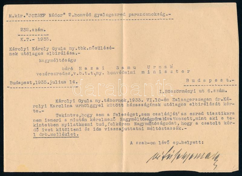 1935 Károlyi Gyula tábornok nősülési engedélykérelme Hazai Samu vezére...