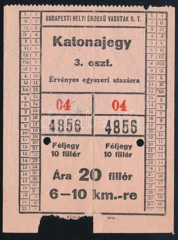 1940 III. osztályú katonajegy, Budapest Helyi Érdekű Vasutak Rt. Pomáz... https://www.darabanth.com/en/454-Online-auction/454.0/Art-and-other-collectibles/Military~1500008/1940-III-osztalyu-katonajegy-Budapest-Helyi-Erdeku-Vasutak-Rt-Pomazrol-Budapestre-6-10-km-~II3025697