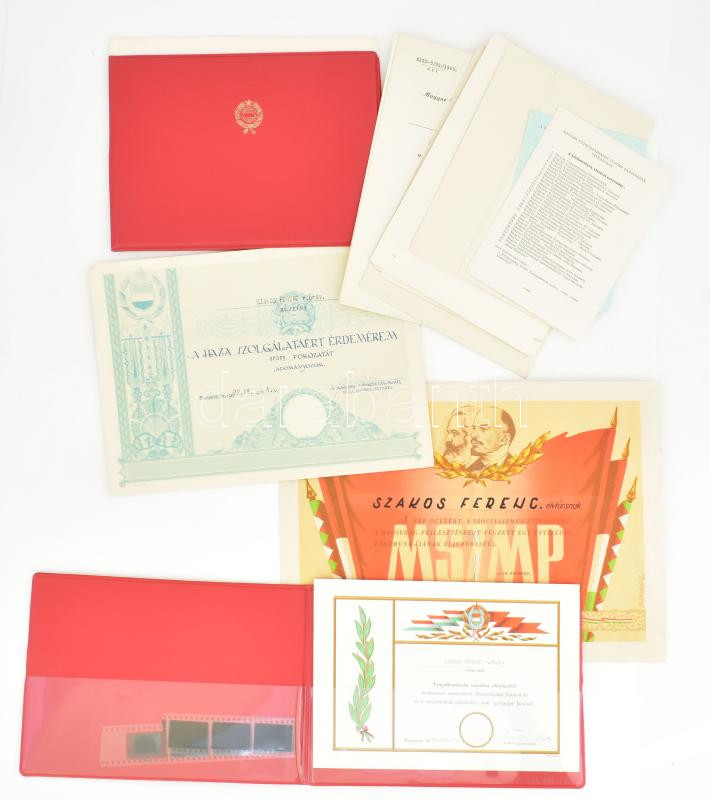Description: cca 1960-1980 Szakos Ferenc rendőr őrnagy okmányai: kitüntetés adományozó oklevelek és viselési igazolványok (A Haza Szolgálatáért Érdemérem arany fokozata, ,,Kiváló Szolgálatért" Érdemérem, stb.), a kitüntetések viselési sorrendje, egyéb oklevelek. Összesen kb. 20-25 db. Vegyes állapotban.