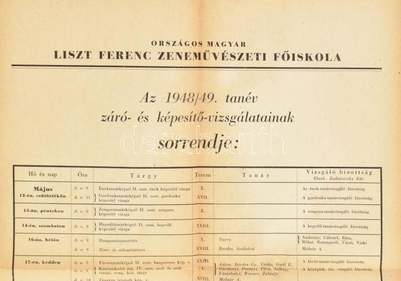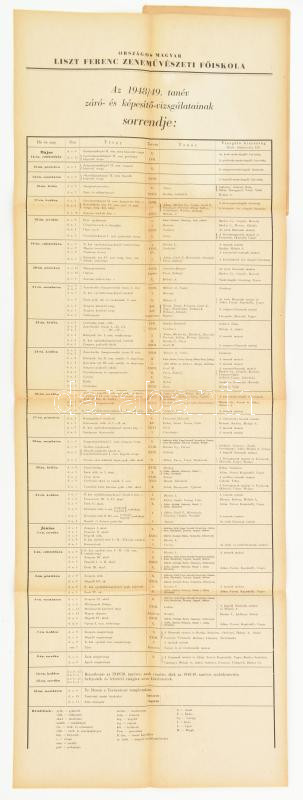 1948 Országos Magyar Liszt Ferenc Zeneművészeti Főiskola, Az 1948/49. tanév záró- és képesítő-vizsgálatainak sorrendje, nagyméretű táblázat, egy-két kis lapszéli szakadással, hiányos borítóval, 75x26,5 cm